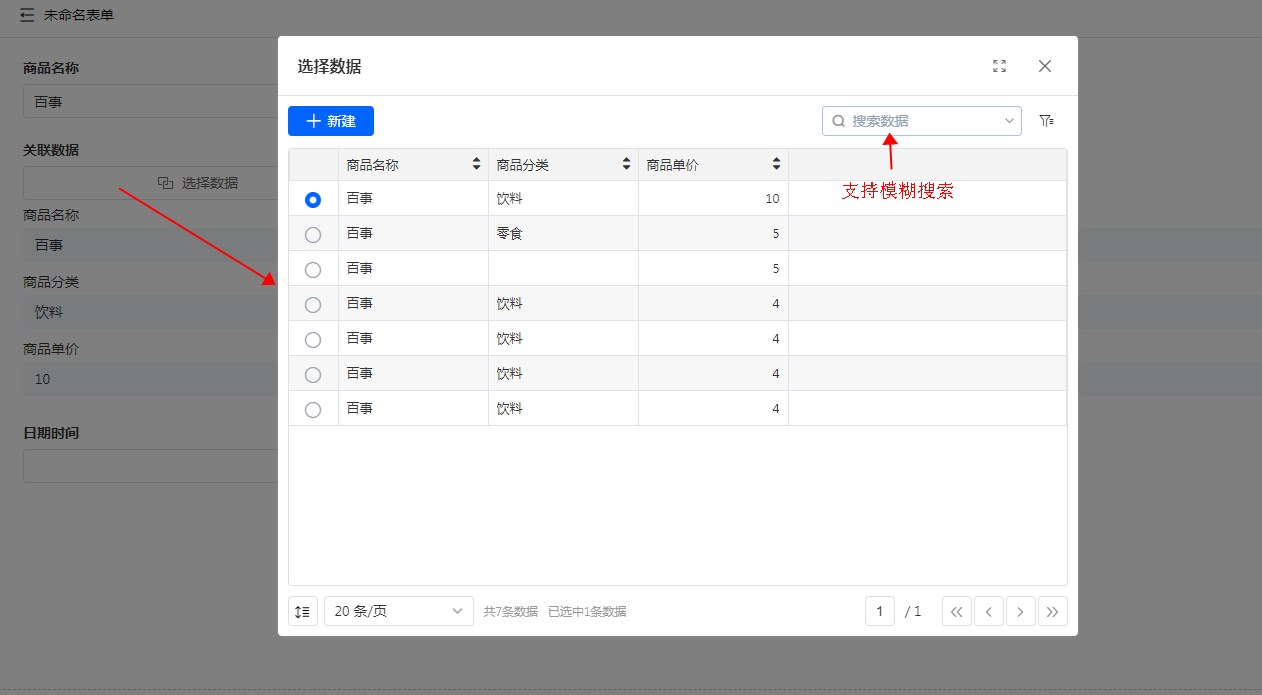 关联数据字段,点击【点击关联数据】按钮出现的表格,支持搜索和清空。