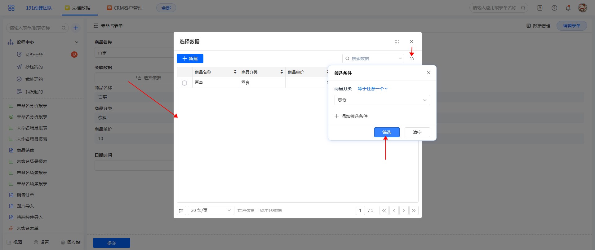 • 通过与当前-表单的控件进行联动,对关联表的数据进行过滤,在关联字段中显示出符合限定条件的数据。