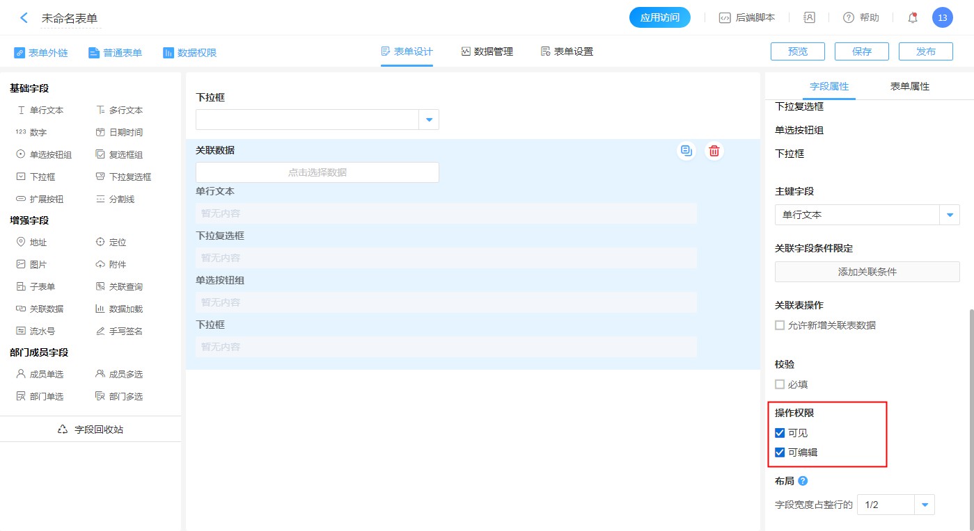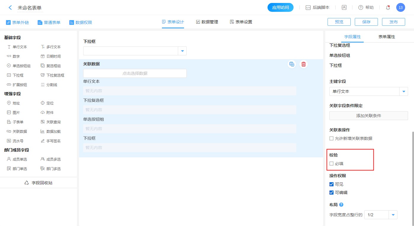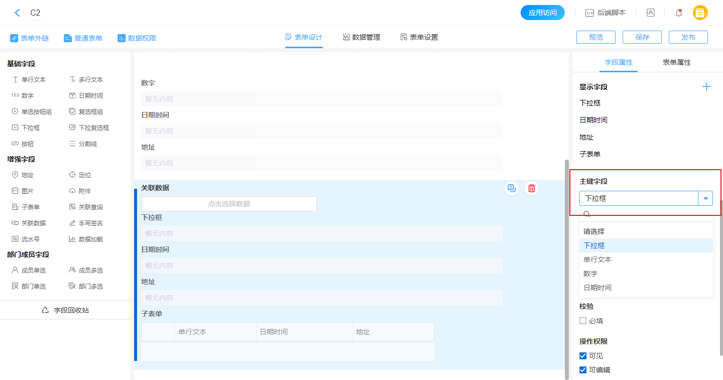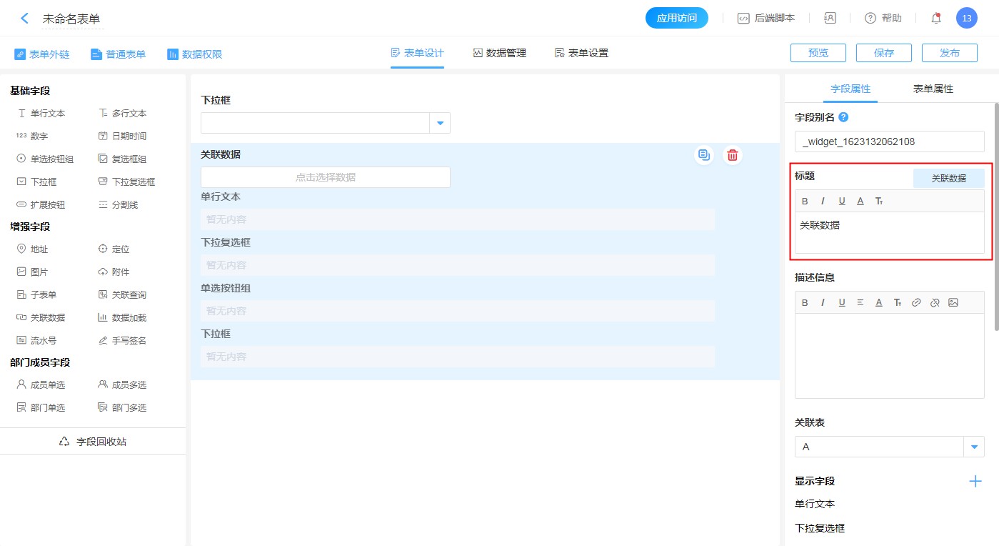 关联表指获取数据的来源表,通过下拉列表来指定要关联的表单。