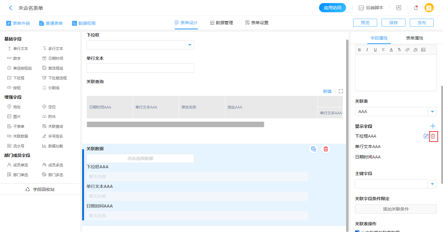 删除关联字段:点击关联字段的删除按钮,此字段不再被关联。