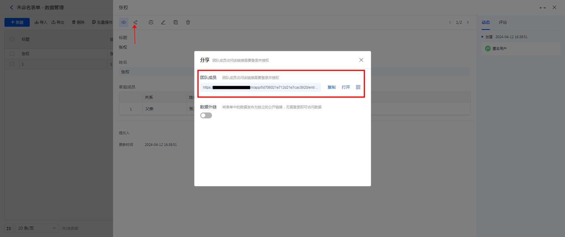 可以将自动生成的“数据内链”的链接地址或二维码分享给团队成员,被分享者可直接查看当前数据的详细信息。