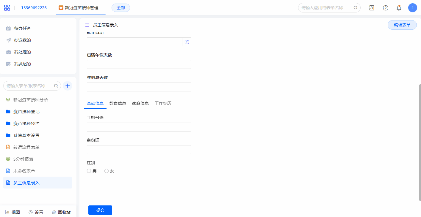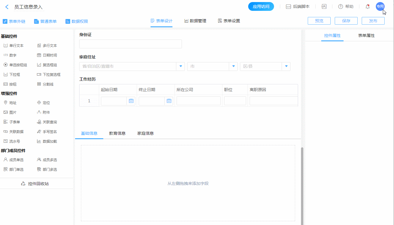 例如:新员工入职表单当中,分别需要登记员工的家庭信息、教育情况、工作经历、婚育情况等等。