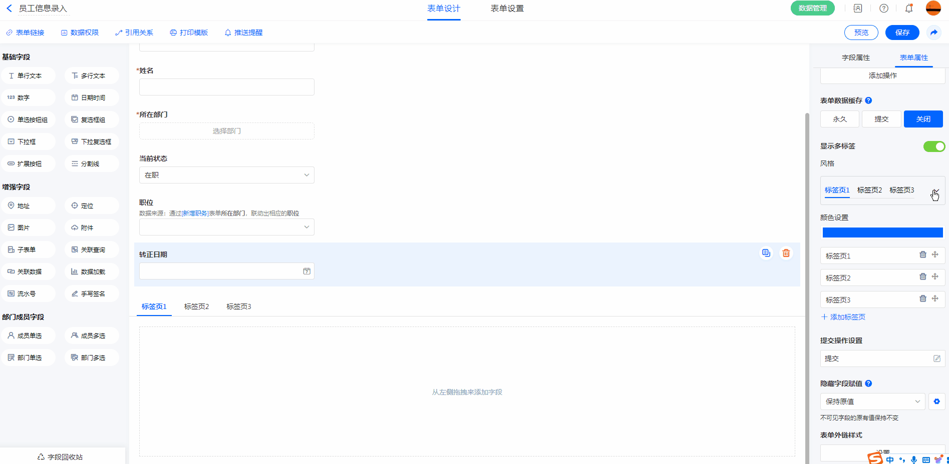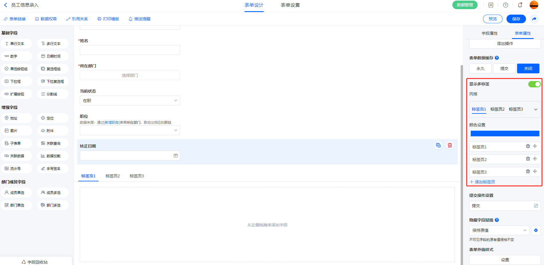 3. 删除标签页或关闭标签页时,标签页中所有字段将按字段顺序放回表单中;