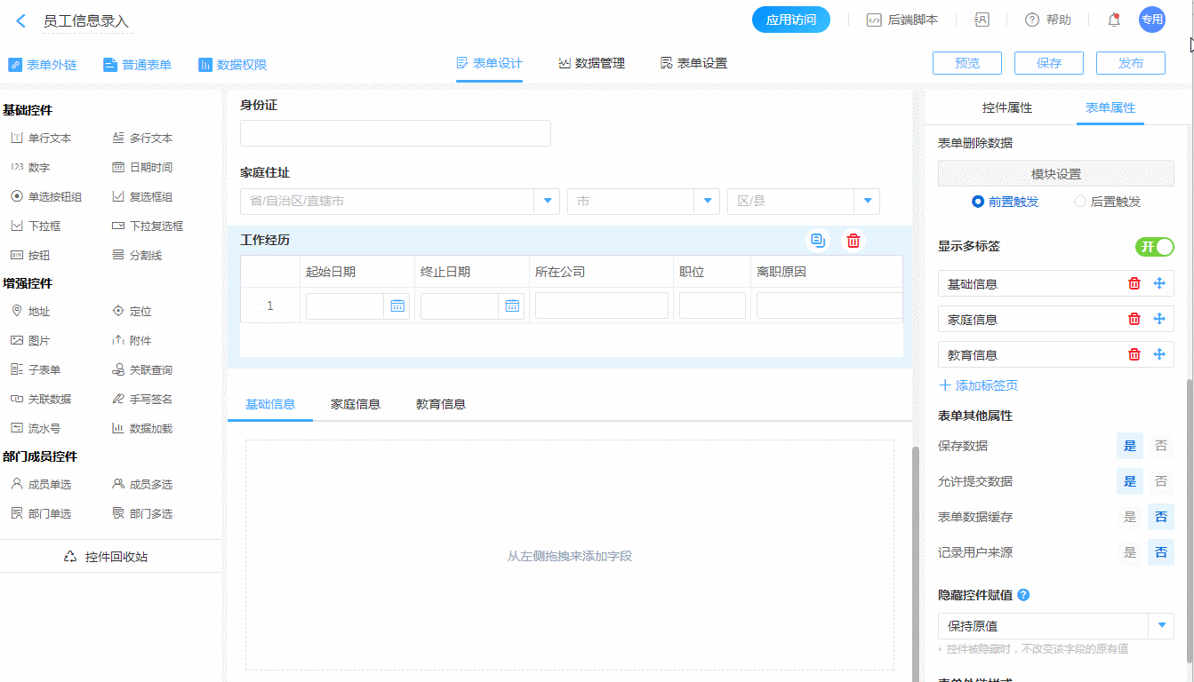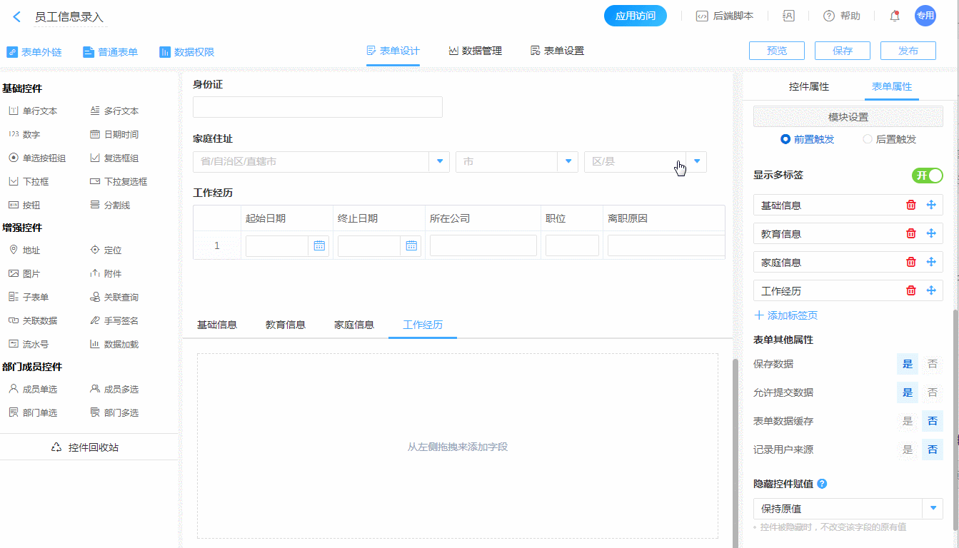 • 如表单控件太多,除了可以选择分成多张表单录入外,还可以通过分标签的布局方式,可以让我们的数据结构更加分明。