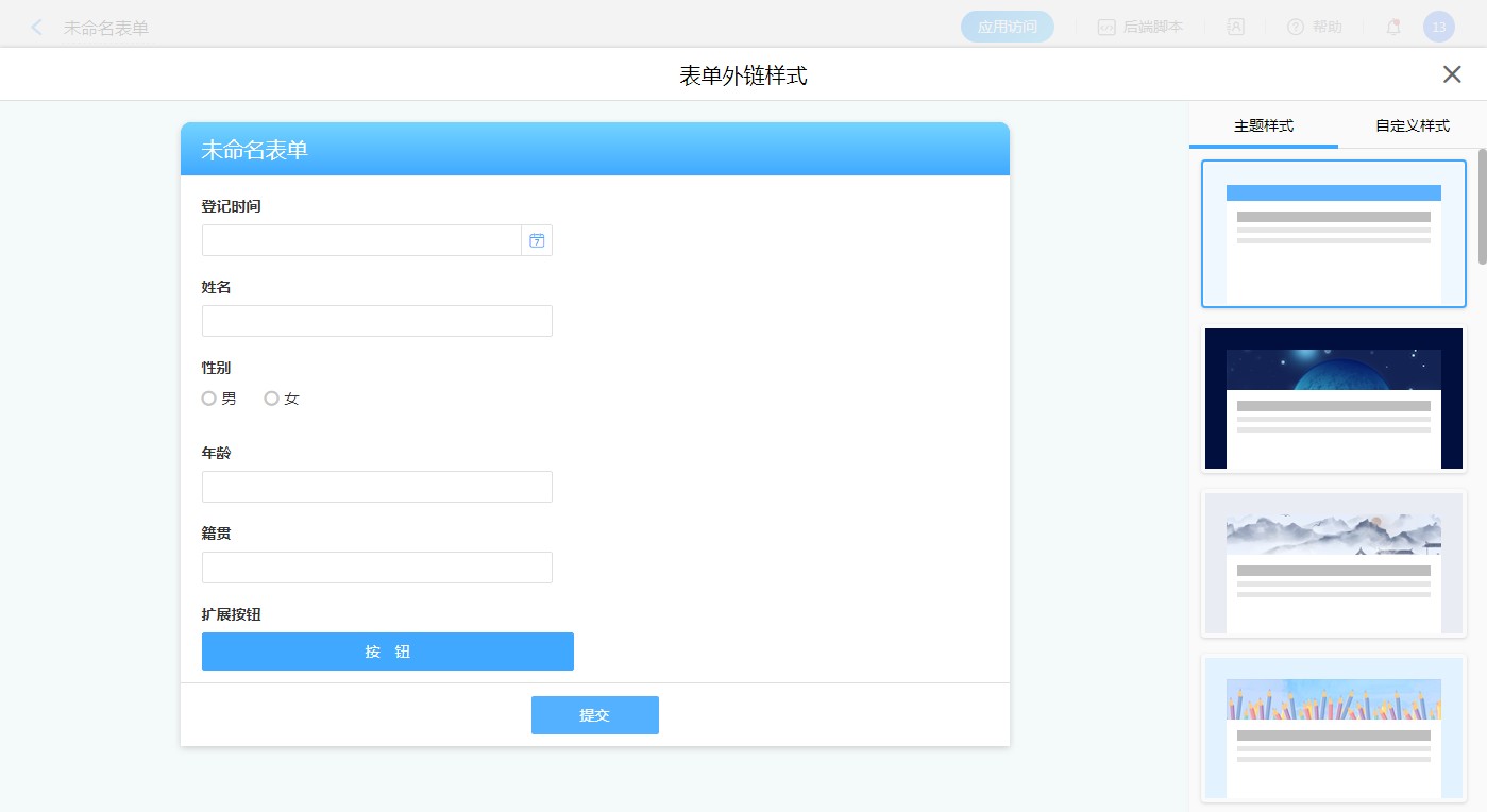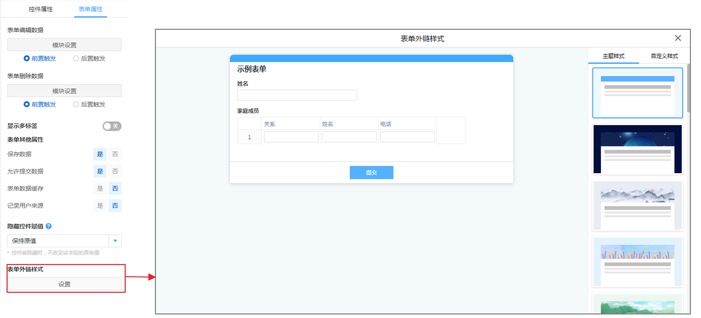 表单外链的样式分为主题样式和自定义样式,主题样式即重深内置的样式模板我们选择就可使用。自定义样式即由自己自定义设置。