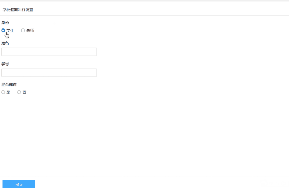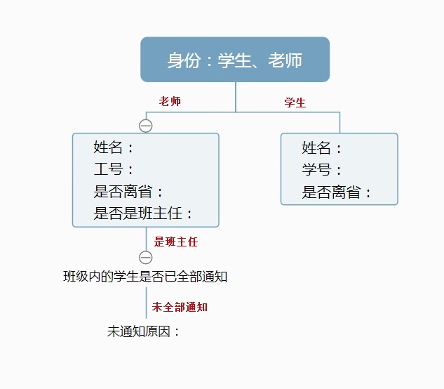 • 如学校假期期间行程调查的表单中,学生身份填写:【姓名】、【学号】、【是否离省】等字段;老师身份填写:【姓名】、【工号】、【是否离省】、【是否是班主任】等字段,当是班主任时,还需要填写【班级内的学生是否已全部通知】,如果未全部通知,还需要填写【未通知原因】。