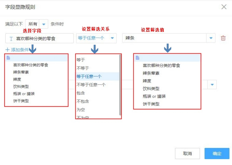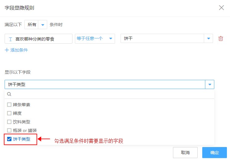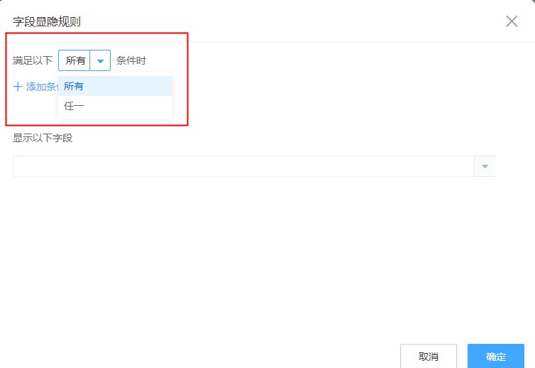 一个字段显隐规则可添加多个条件。多个条件间的逻辑关系可以是满足所有或者满足任意一个。