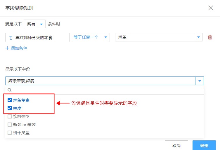 • 当【喜欢哪种分类的零食】选择[辣条]时,显示【辣条荤素】、【辣度】字段