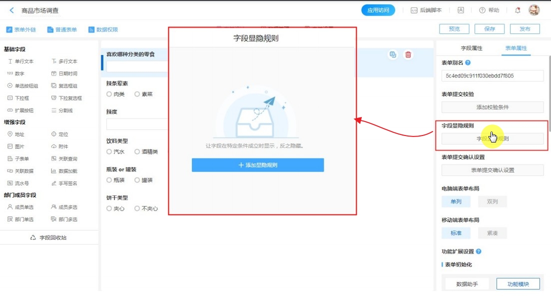 • 普通字段:表单设计-表单属性-字段显隐规则