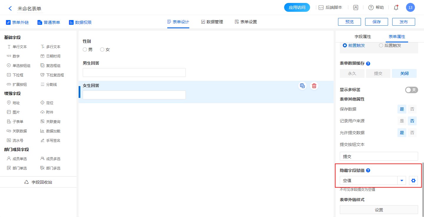 1. 表单属性,设置隐藏控件赋值方式为“空值”。