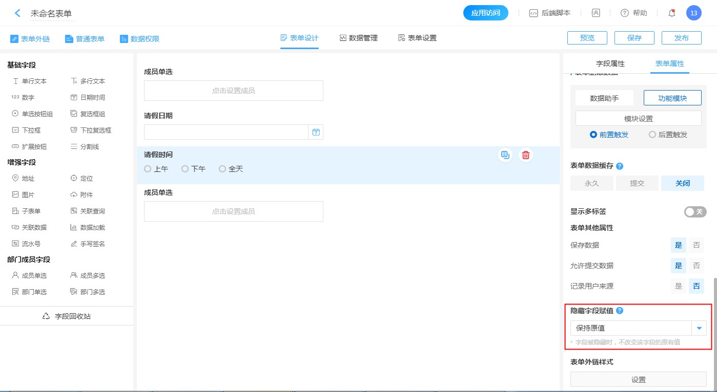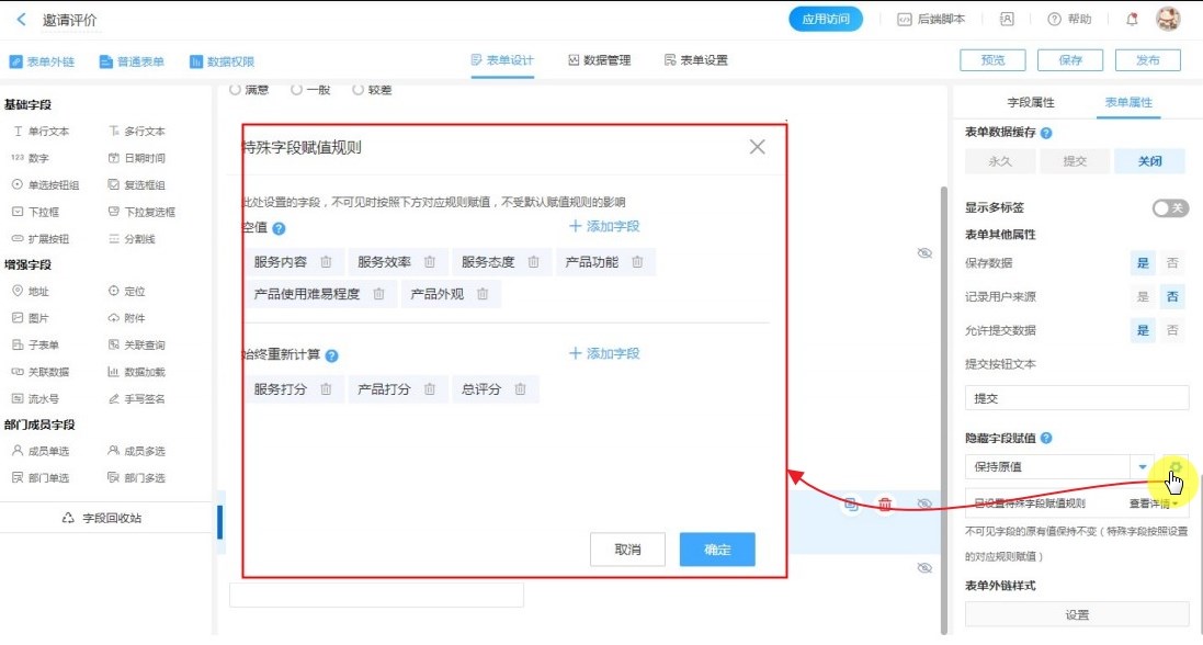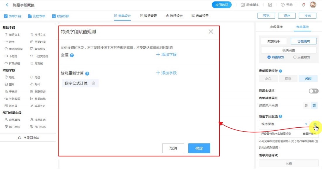 在实际业务中,单个表单中有可能存在多个不可见字段,针对这些字段需要同时设置不同的赋值规则,这时候就可以对部分字段设置特殊的赋值规则。