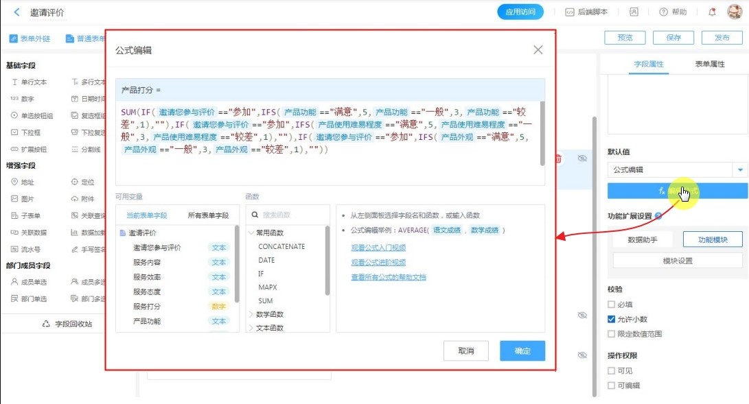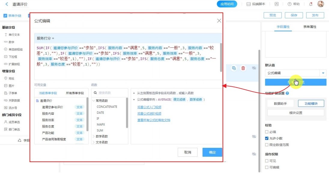 【服务打分】的默认公式取值,公式设计如下: