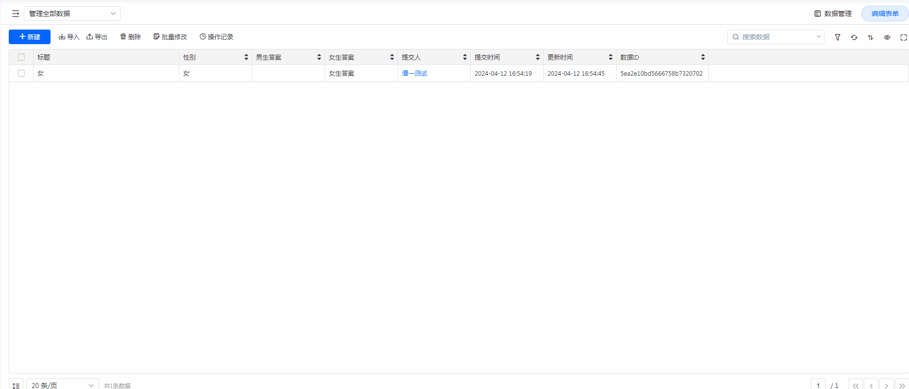 1. 录入数据。并对第一条数据进行修改。修改选项后,“男生回答”控件成为隐藏状态,则旧值被清空,提交空值。