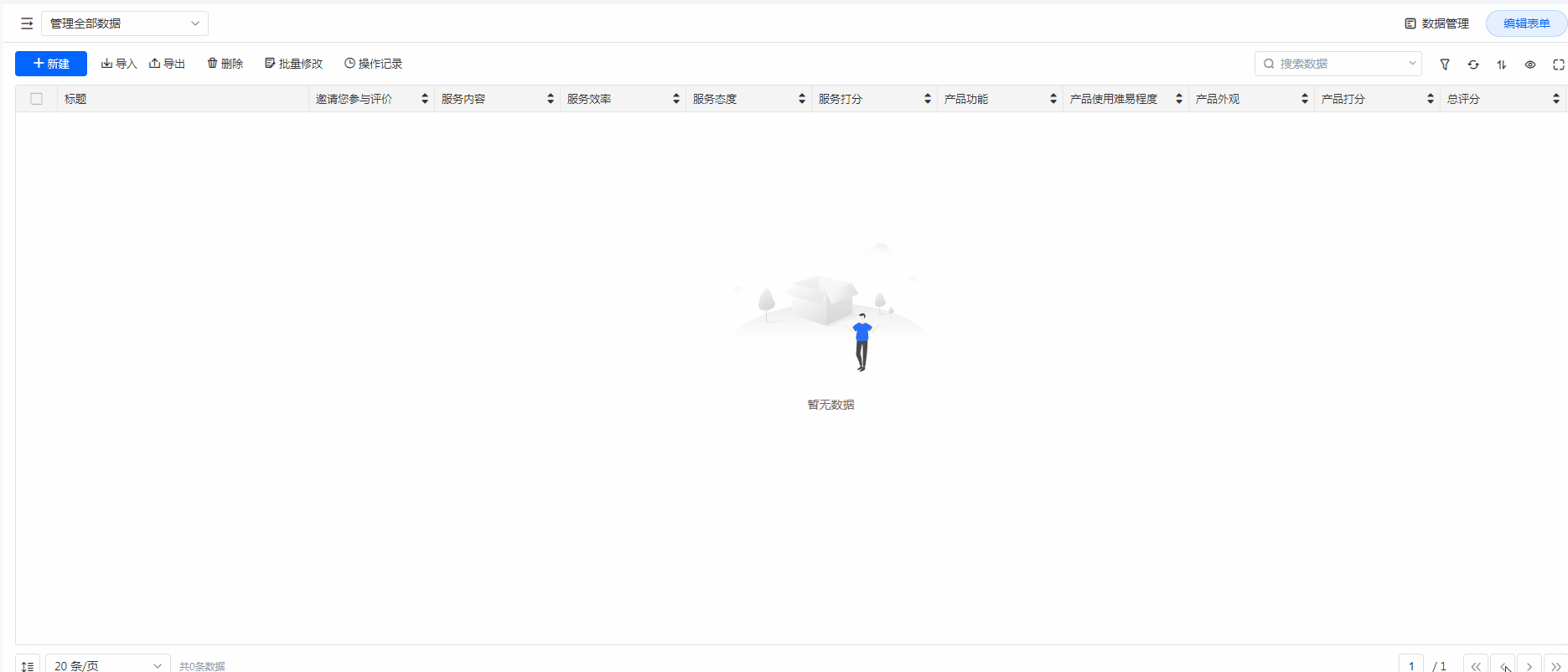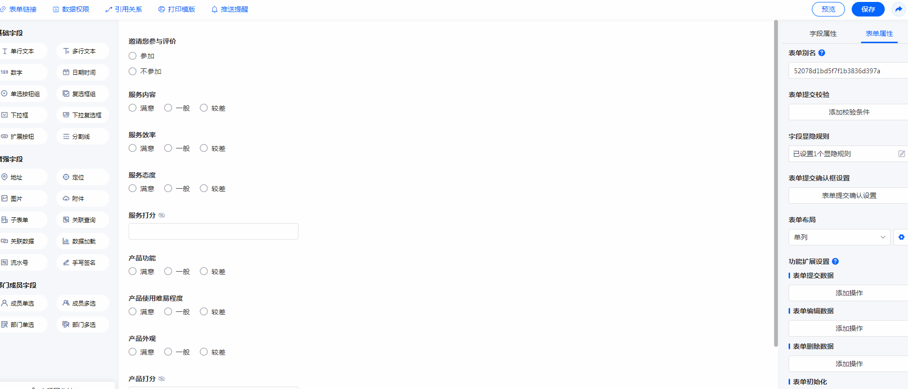 1、邀请评价表单,当参加评价时,会显示【服务内容】、【服务效率】、【服务态度】、【产品功能】、【产品使用难易程度】、【产品外观】字段。 无论参不参与评价,【服务打分】、【产品打分】、【总评分】字段始终隐藏,不给提交人员展示。