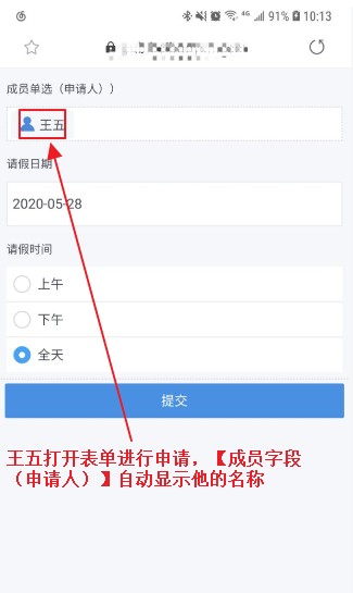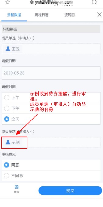 1. 请假表中的2个成员单选字段,默认值均设置为“当前用户”,来获取流程发起人和审批人的姓名。