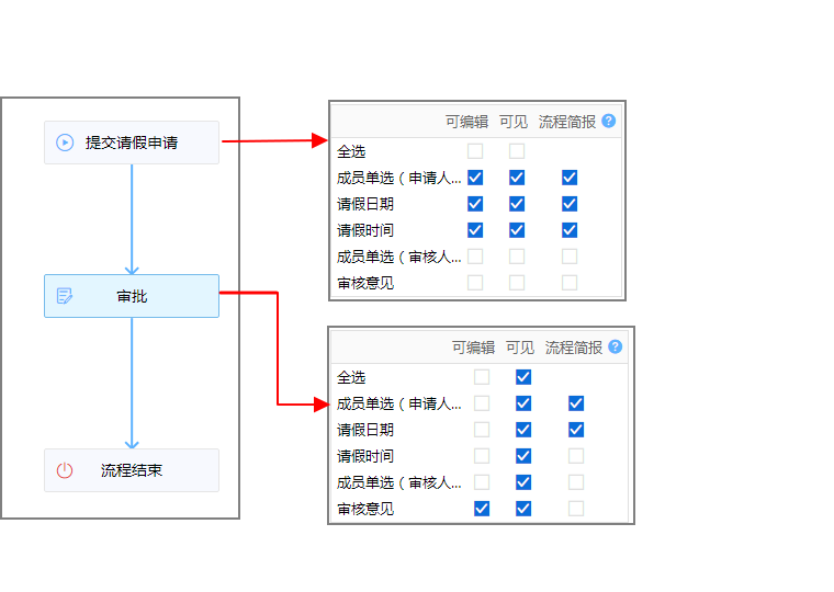 1. 设定流程节点和操作权限。成员控件在对应的节点上选择可见,在该节点之前选择不可见。