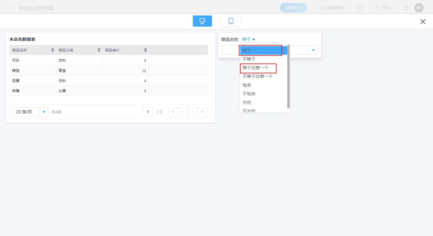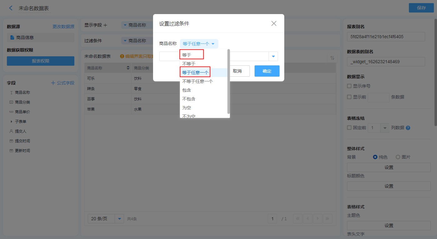 • 当报表访问,设置的查询条件为索引字段且筛选条件操作符为等于或等于任意一个时,索引字段即可生效。