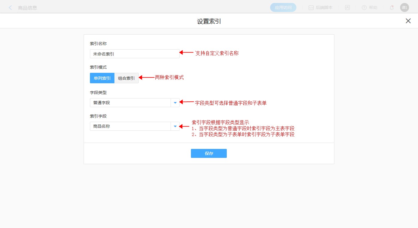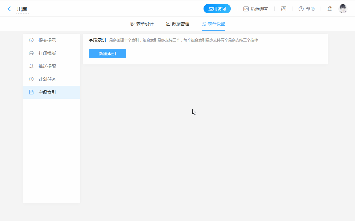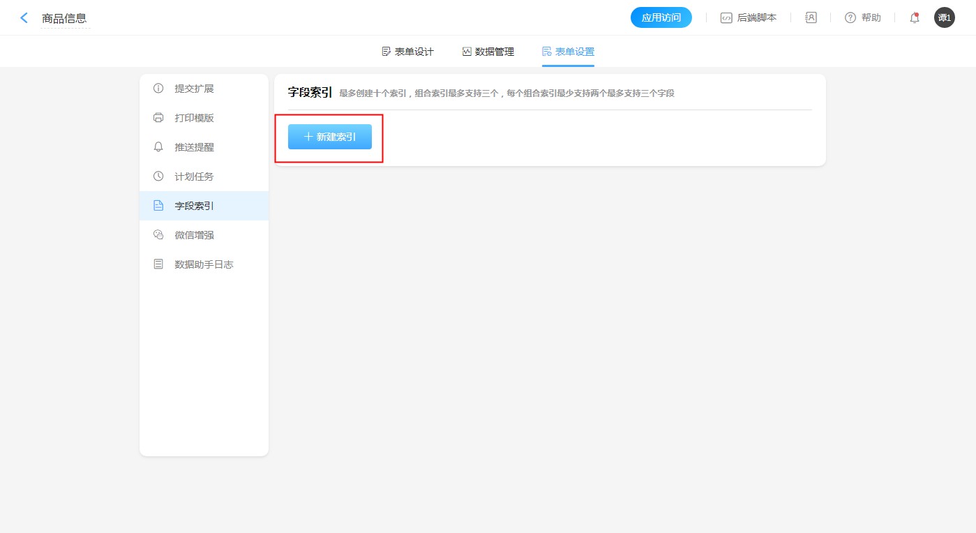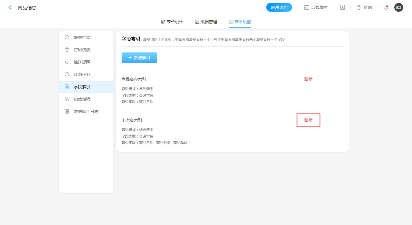 • 索引支持添加和删除,以及被动删除。字段索引设置页面可以主动添加和删除管理,被动删除指设计表单时,删除了字段,那么对应的索引设置会修改或者删除。