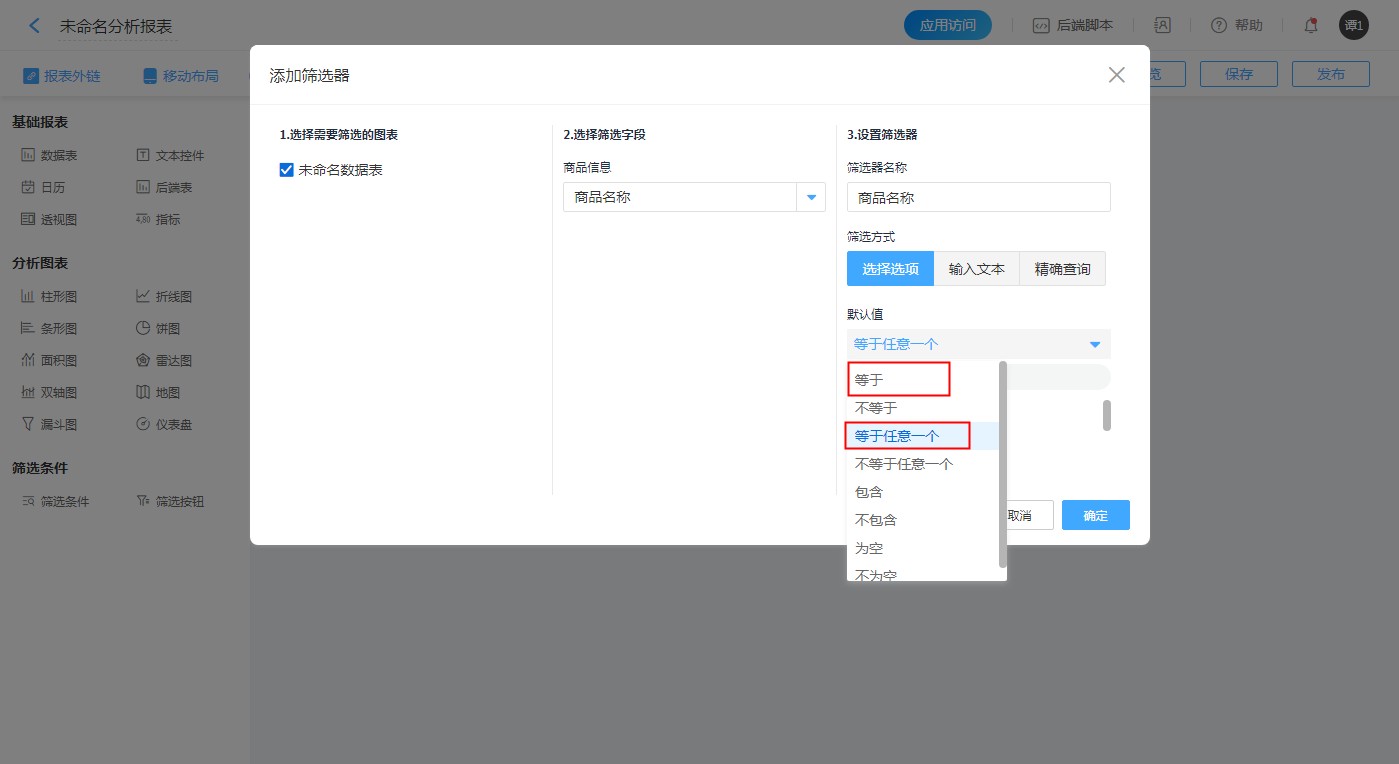 步骤:【报表编辑】——【添加数据源并设置字段】——【筛选条件】——【添加筛选器】