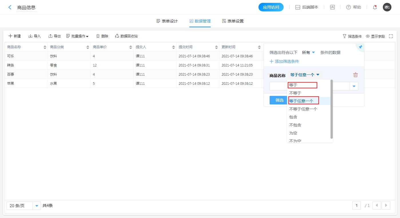 步骤:【表单设计】——【录入数据】——【数据管理】——【筛选条件】