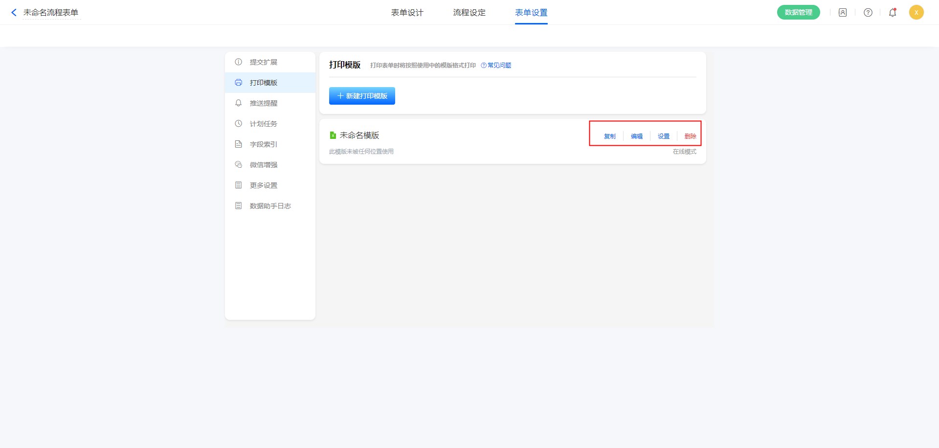 创建打印模板之后,可通过右侧功能按钮进行“复制”、“编辑”、“设置”、“删除”等操作。