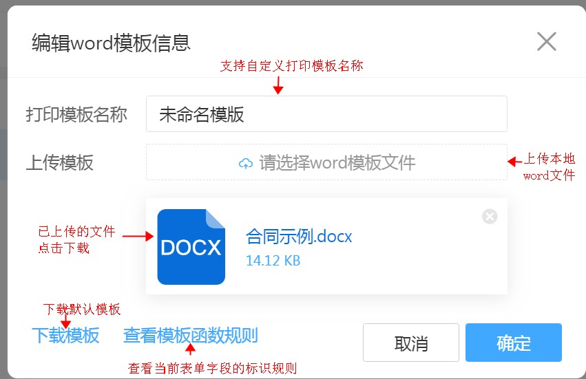 • word模式的打印模板,点击【编辑】按钮后,弹出【编辑word模板信息】弹窗,在此弹窗中可以修改打印模板名称、重新上传打印模板、下载当前模板、下载默认模板、查看模板函数规则。