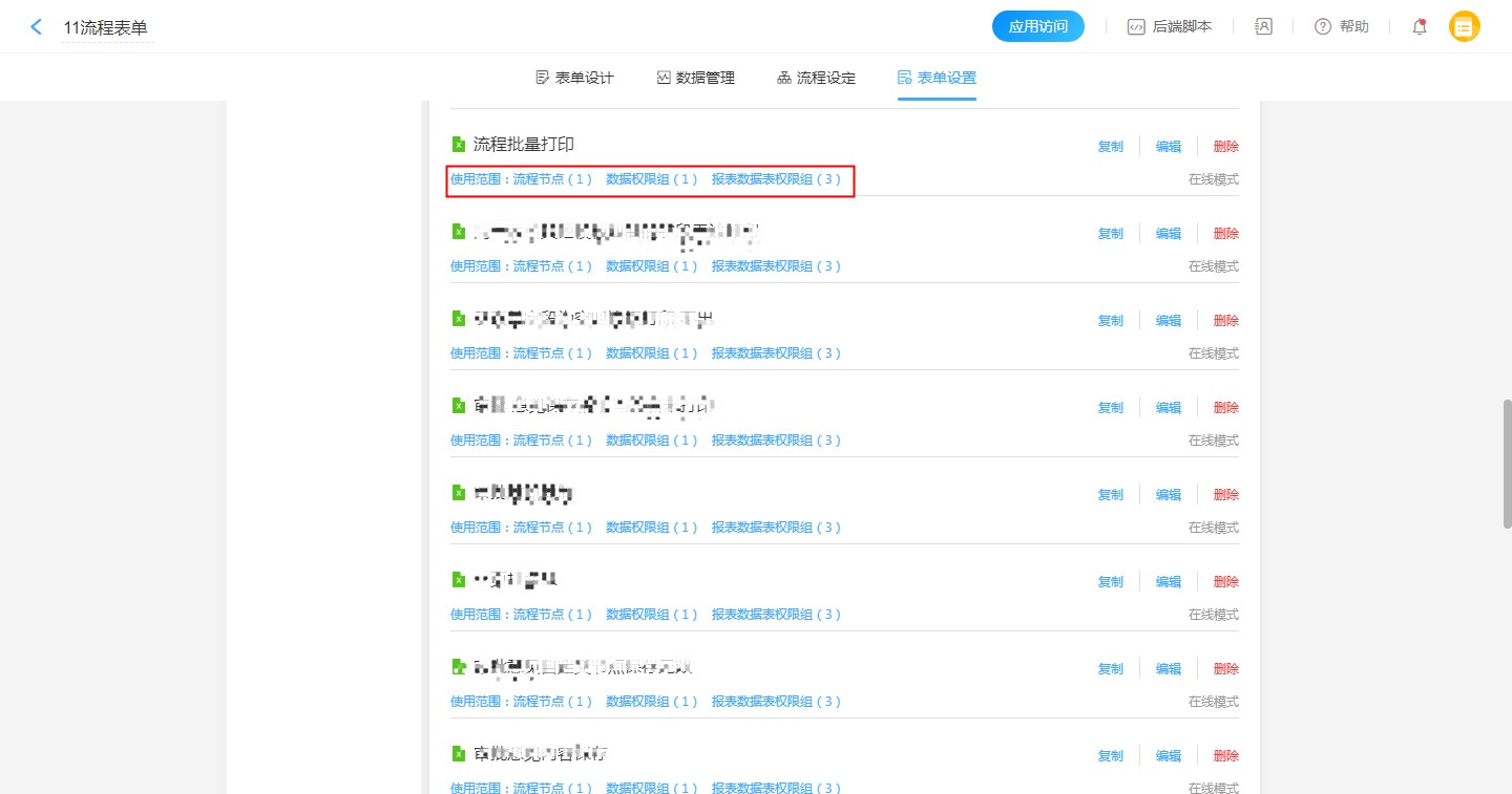 注意:复制打印模板到同应用的其他表单后,需要对打印模板进行稍作修改,主要是字段,因为字段每次生成时,其内部ID不同;