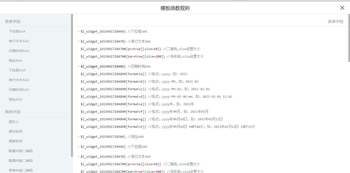 • 此处可以查看当前表单的所有字段的标识规则,在编辑本地word打印模板时,建议从此处复制字段标识及相关字段规则。