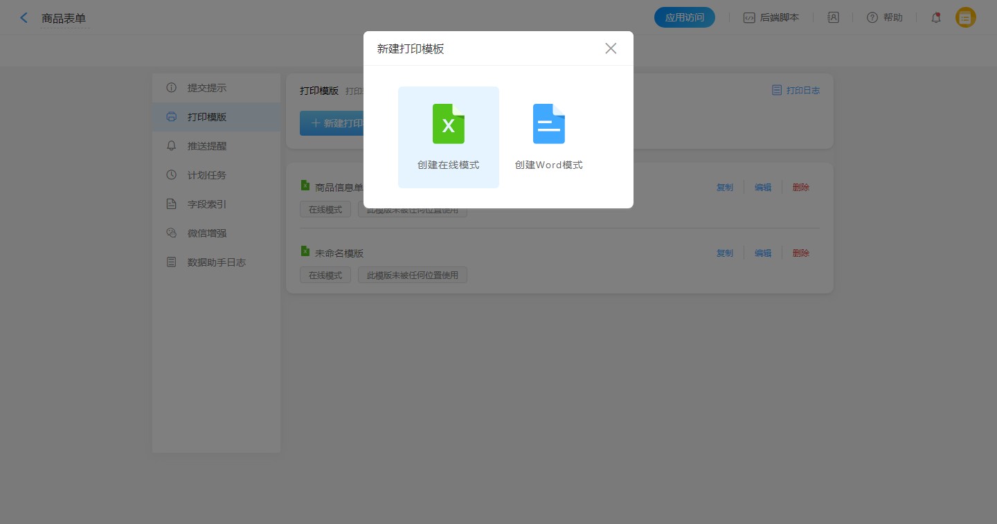• 可以通过复制功能,将打印模板复制到当前表单或同应用的其他表单,复制完成后,可以在表单设置-打印模板中查看到复制的打印模板。