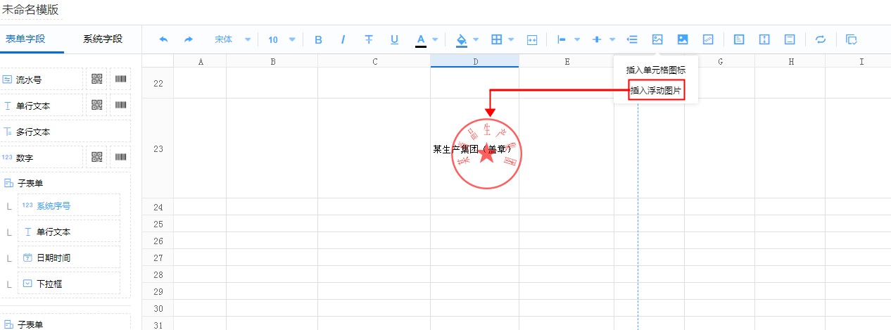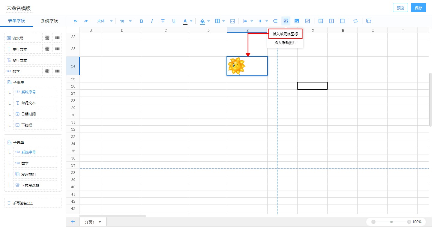 • 插入图片:选中页眉页脚单元格,点击插入图片,可以插入图片到对应的单元格内;图片支持放大缩小。