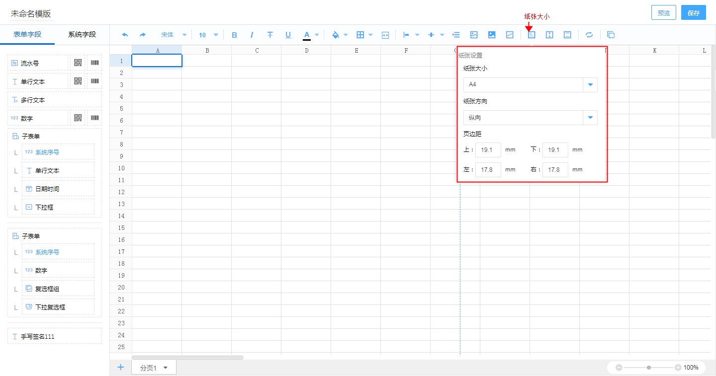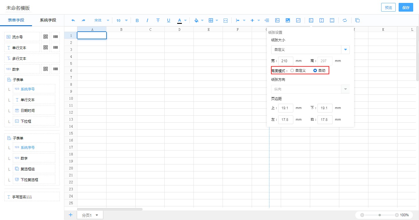 • 支持对模板设计区域进行缩放,缩放范围[10%,400%],默认为100%;