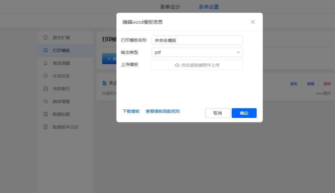 • 第二步:在表单设置-打印模板中,新建word模式打印模板,并将第一步中的word文件上传。