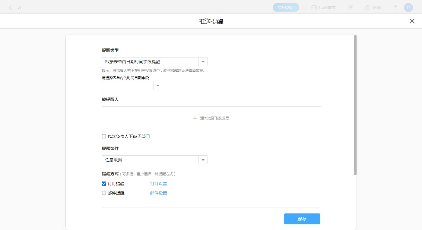 步骤:【表单设置】——【推送提醒】——【新建推送提醒】——【提醒类型】——【根据表单中的日期字段提醒】
