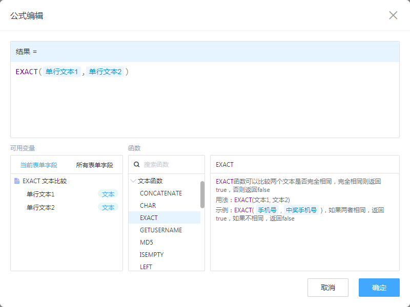 EXACT(单行文本,"hello 世界") 表单字段使用公式:true