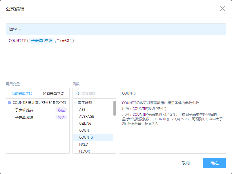一般用于子表单中,判断符合条件的数据,统计其个数。