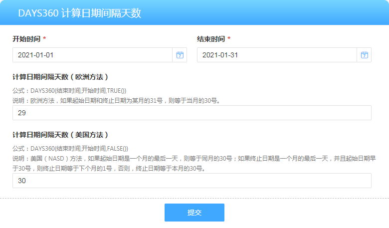 False或省略 美国(NASD)方法,如果起始日期是一个月的最后一天,则等于同月的30号;如果终止日期是一个月的最后一天,并且起始日期早于30号,则终止日期等于下个月的1号,否则,终止日期等于本月的30号。