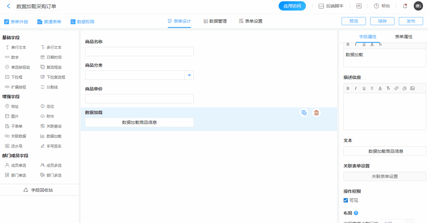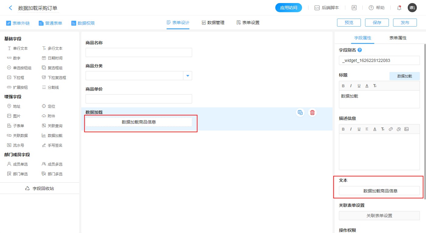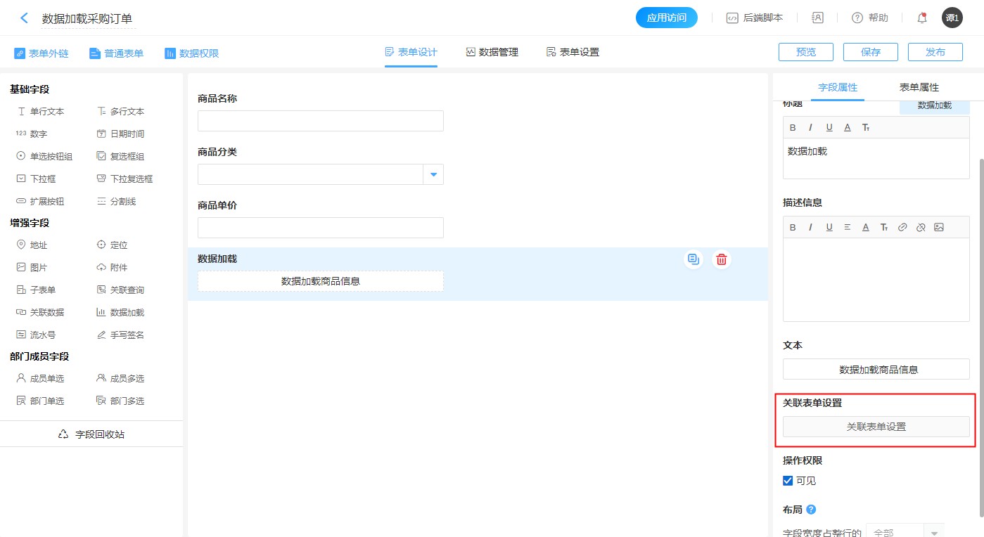 • 在采购订单设计页面添加【数据加载】控件,然后在控件属性栏【关联表单设置】设置数据源以及填充规则等。