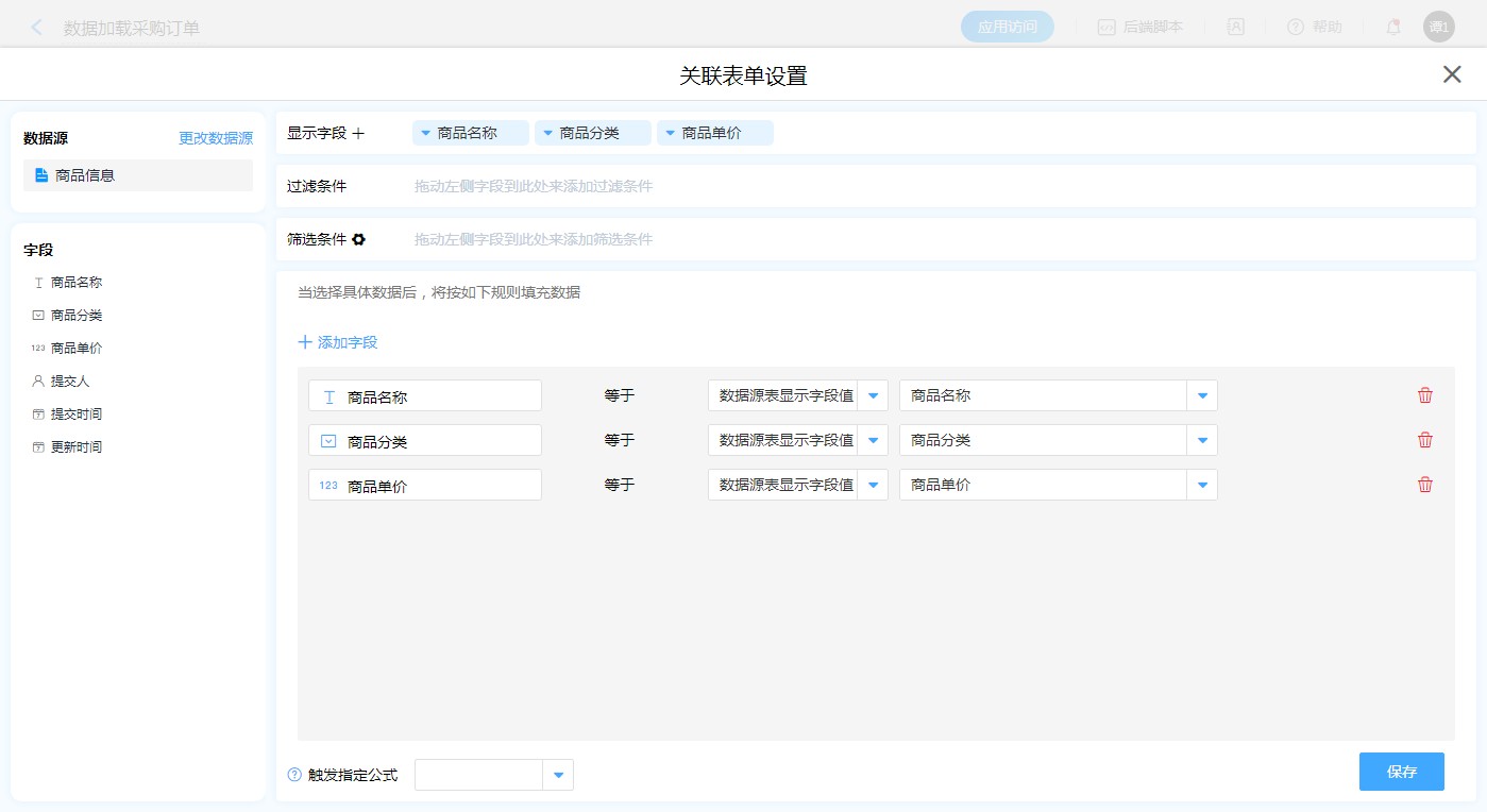 • 公式触发规则:当同时设置数据加载规则和触发公式时,会先加载填充数据然后触发公式;当没有设置触发公式时,只做普通的数据加载填充。