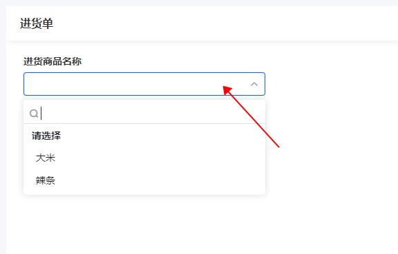 【创建一个[下拉框]标题名称叫“进货商品名称”】——【控件属性】——【选项】——【关联其他表单数据】——【商品表单-商品名称】