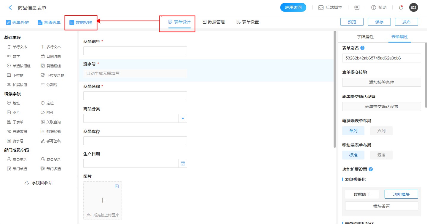 • 先做好表单,然后进入【表单设计】————【数据权限】,进行设定。
