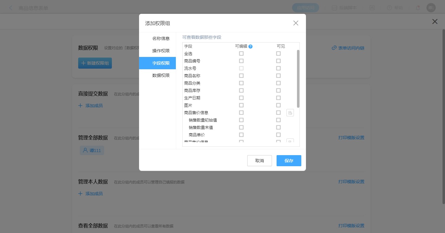 • (2)在有查看、编辑的【操作权限】大前提下,【字段权限】决定了在管理数据时,到底是哪些字段可见,哪些字段可编辑。