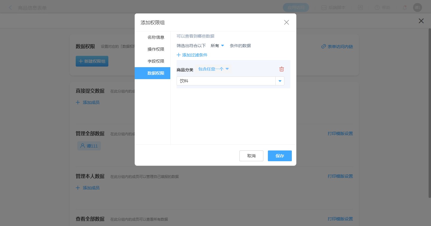 表单类型 权限类型 权限组 操作权限 字段权限 数据权限(过滤条件) 权限范围