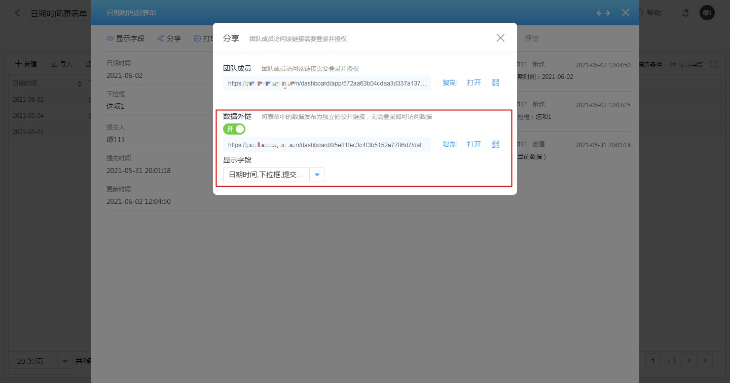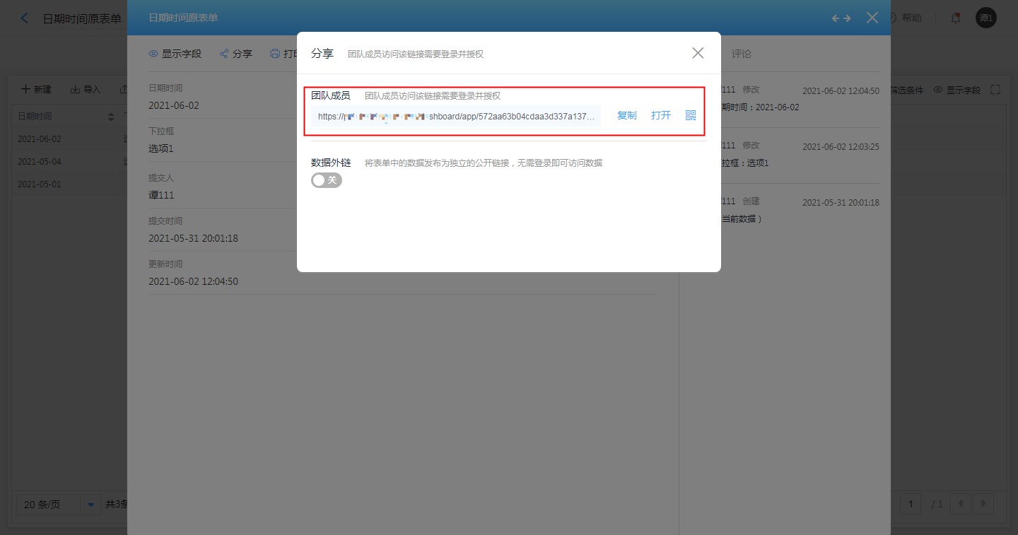 数据链接分享即分享数据管理中的单条数据。分享的对象可以是团队成员和外部人员,如果分享对象是团队成员可以在数据权限中设置该成员的数据权限,外部人员可以直接通过数据外链进行查看数据。