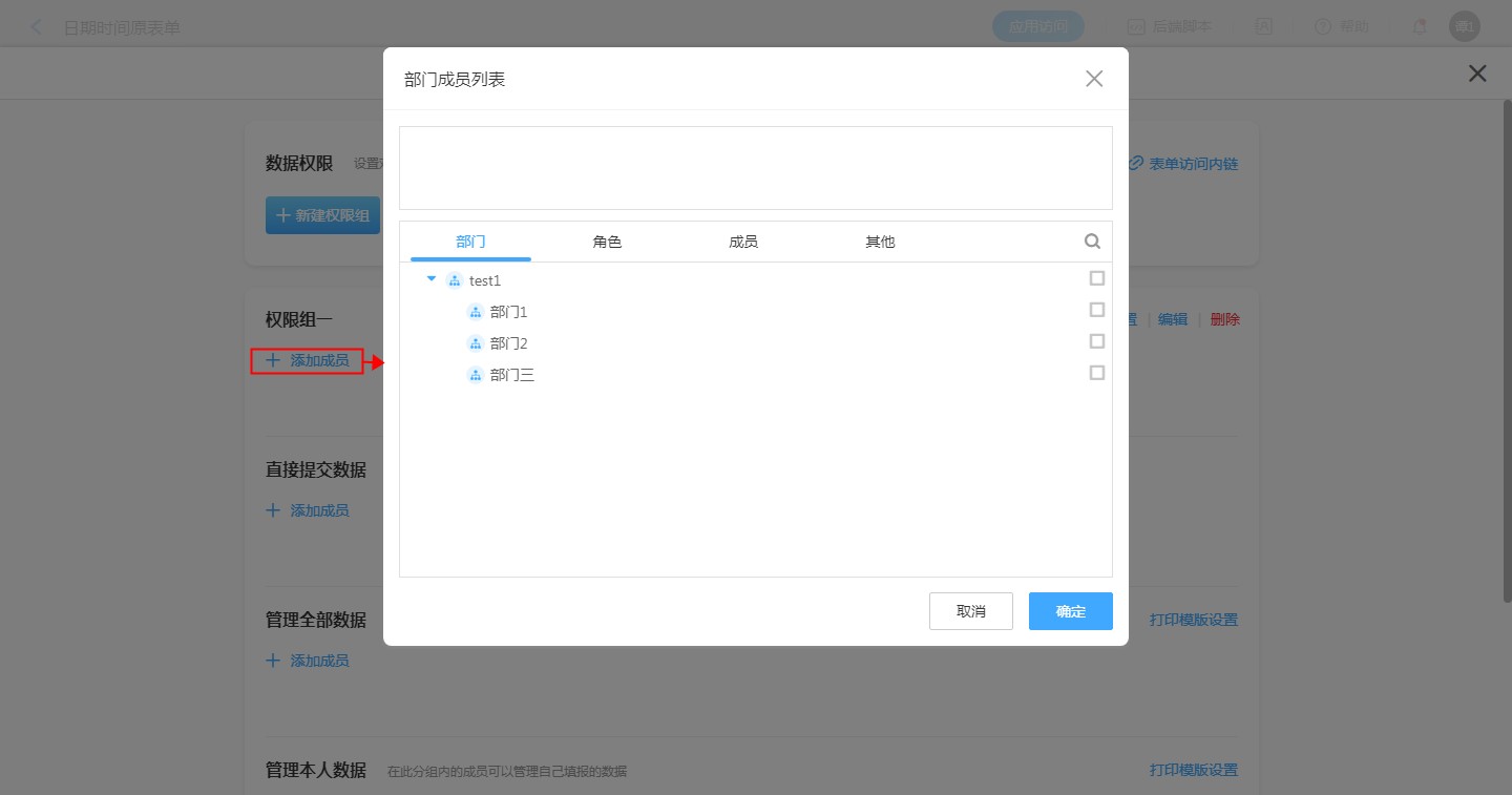 1、给成员设置权限:【表单设计】-【数据权限】——【选择成员】