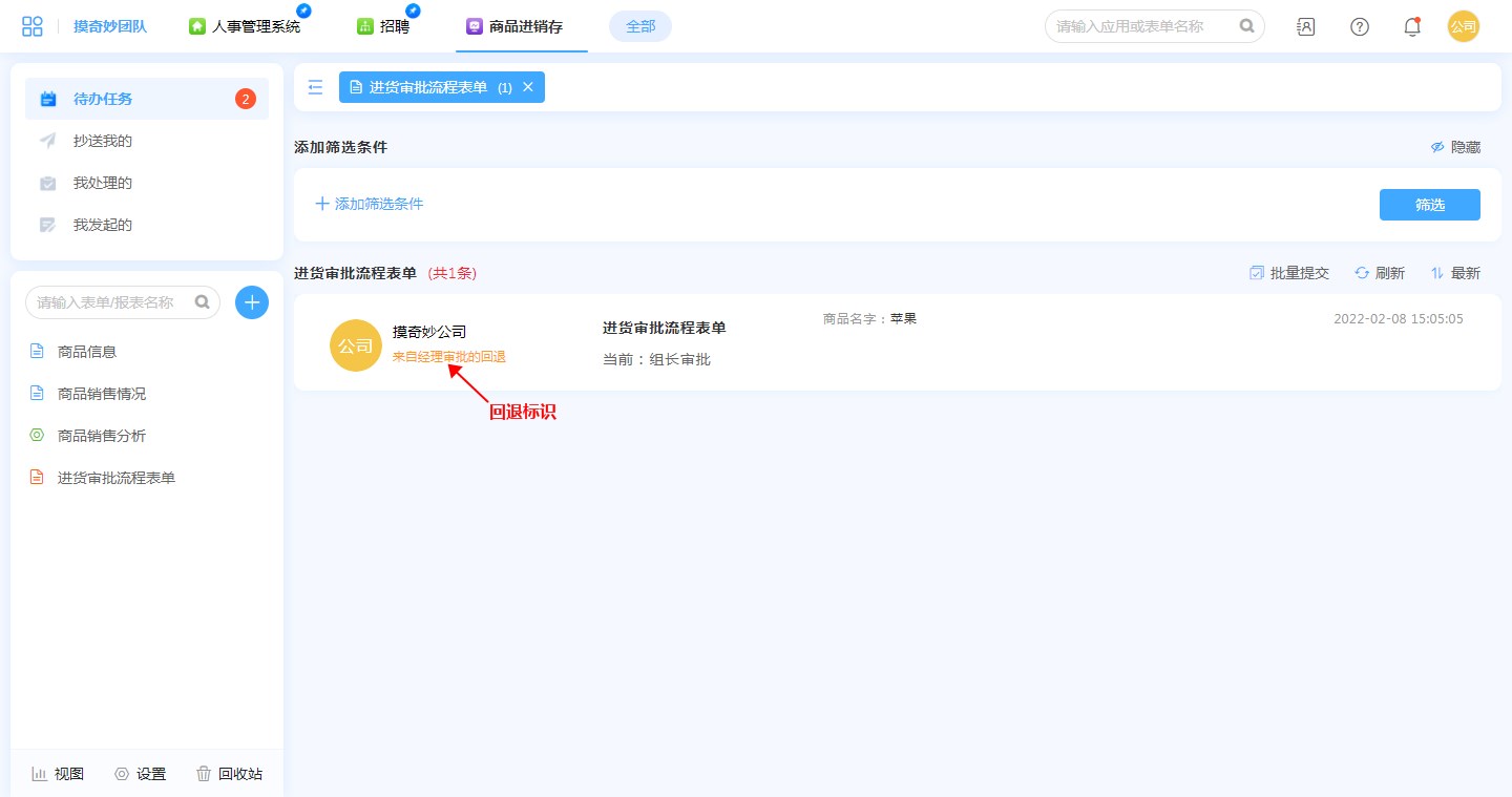 在流程待办中,回退到当前节点的流程带有回退标识,回退标识中记录了操作回退的节点信息。