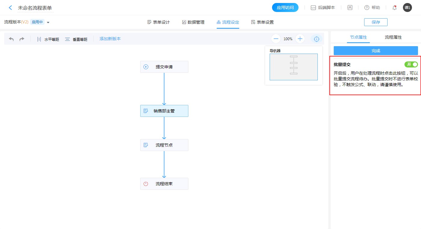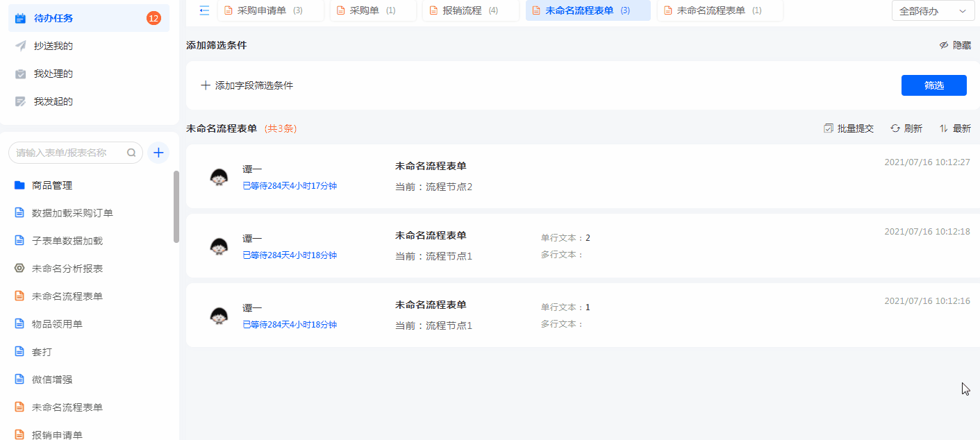 开启批量提交后,即流程负责人在【待办任务】可以批量处理流程,只批量处理流程(不处理数据)。