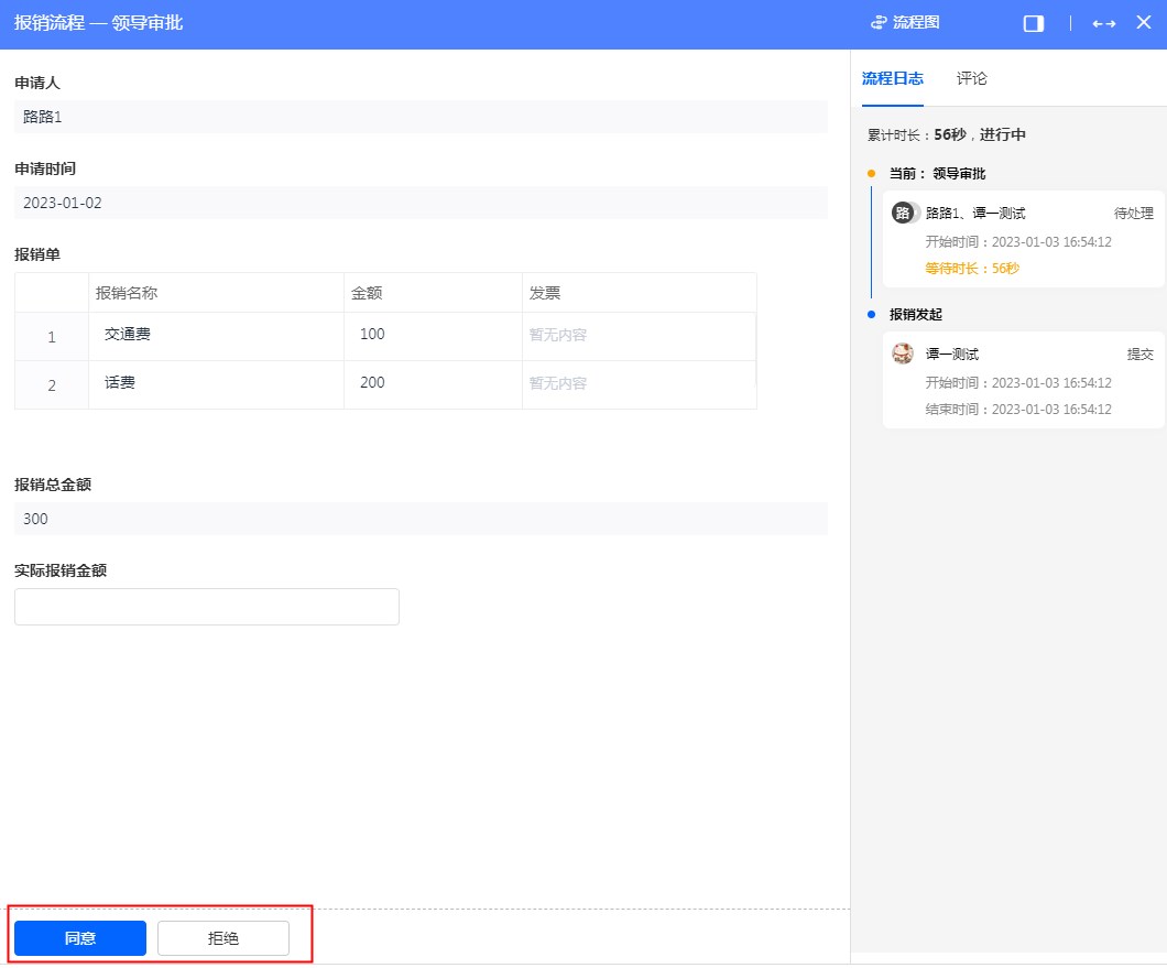 设置完成后,当在目标流程节点时,流程处理就会有【同意】和【拒绝】按钮,如下图: