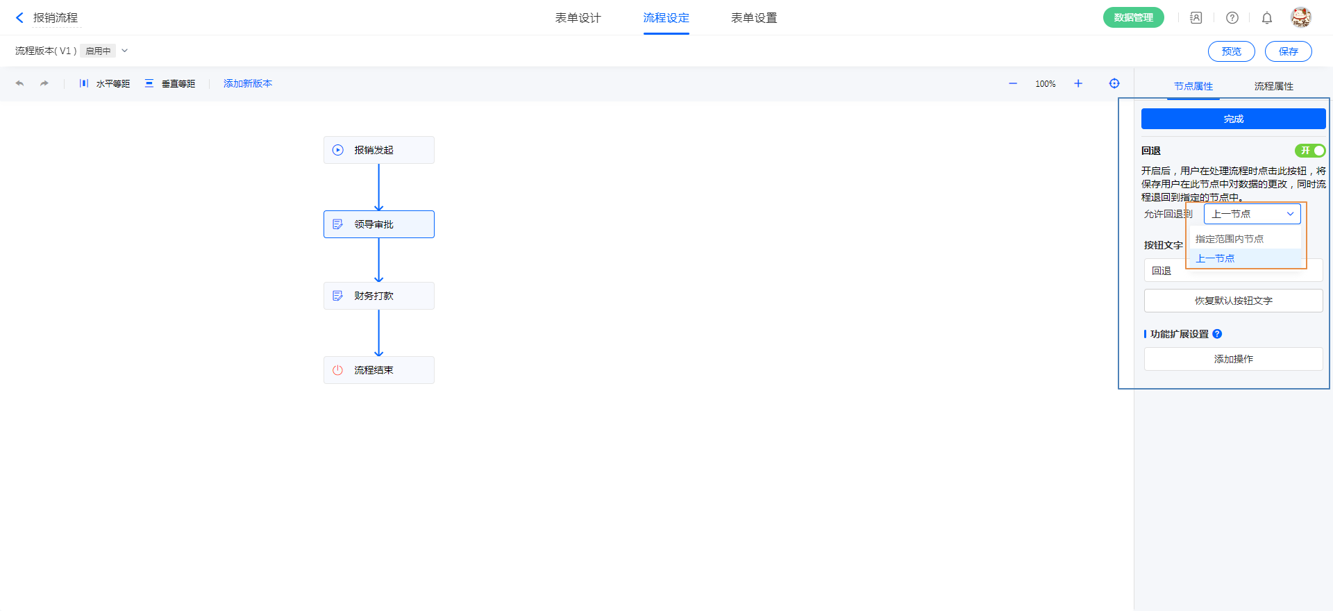 开启回退后,可设置流程回退的位置: