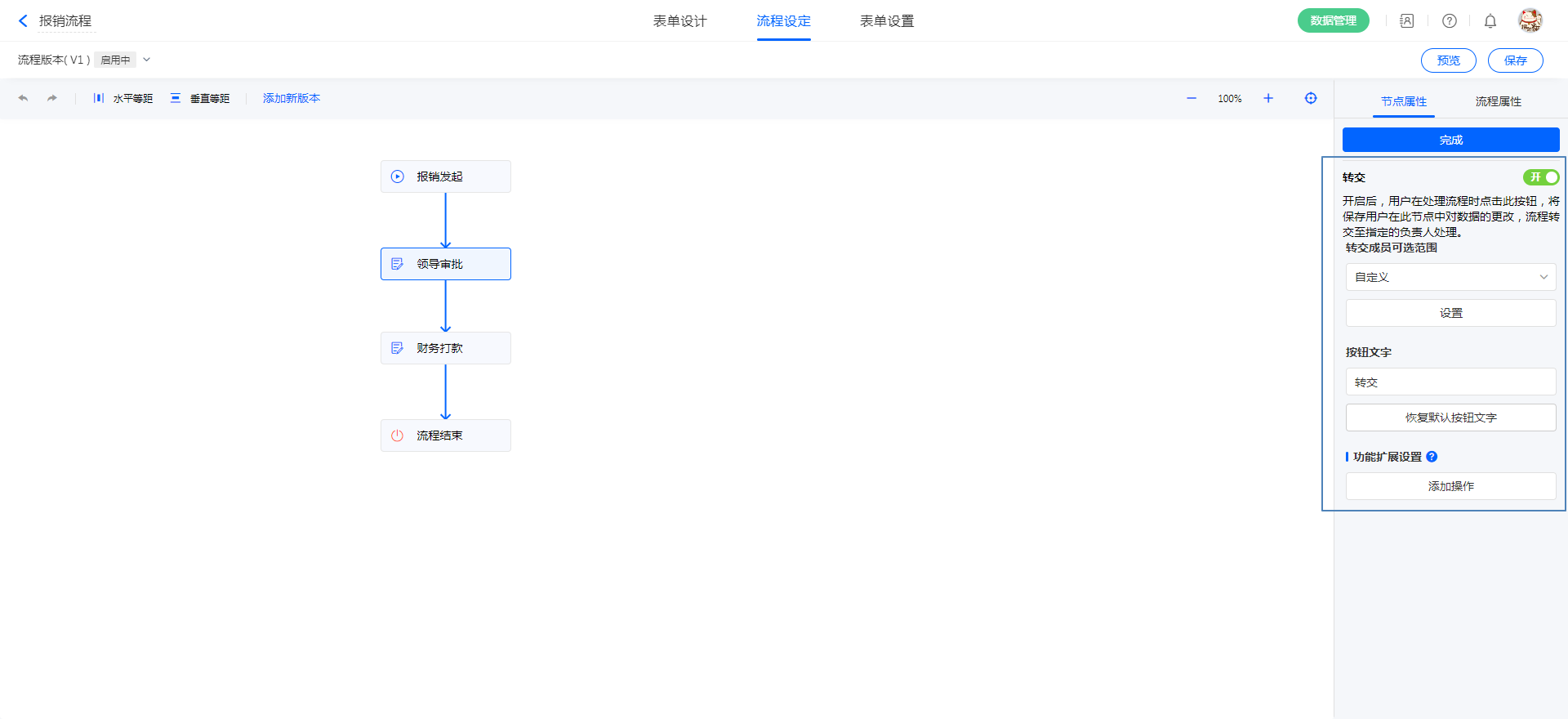 每一个流程节点的节点权限包括提交、暂存、提交并打印、回退、转交、结束流程、批量提交这7种操作,所有节点权限均可自定义按钮文字和安装功能插件,除提交以外,其他节点权限均可根据需求关闭。