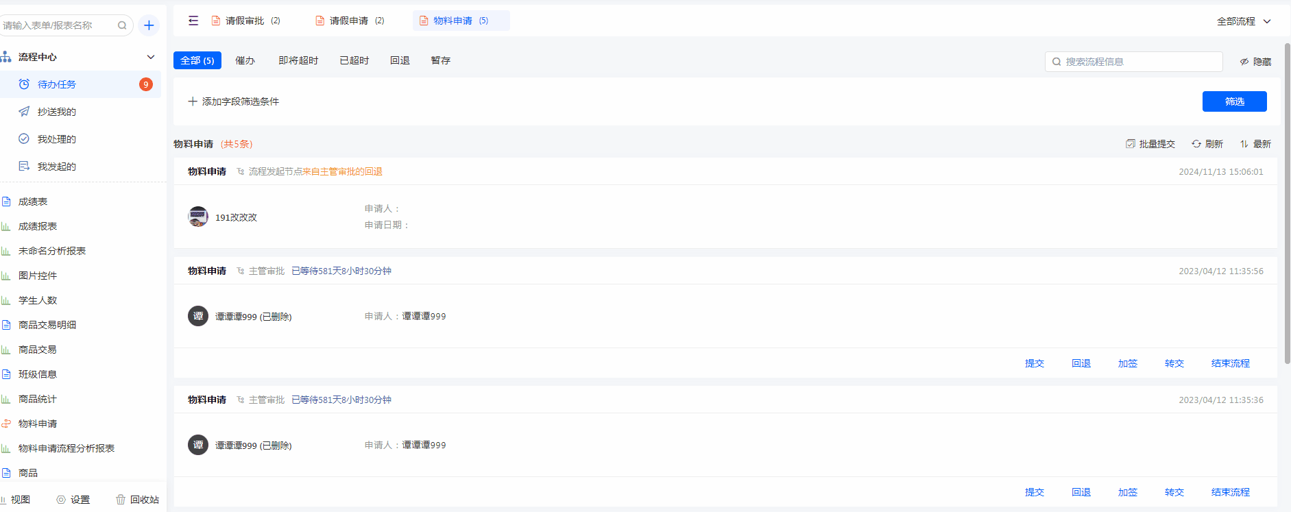 批量提交 当前节点负责人可批量提交流程(200条/次)。注意:批量提交不处理数据 常用于待办数据积压过多,需要快速处理自己的待办流程。